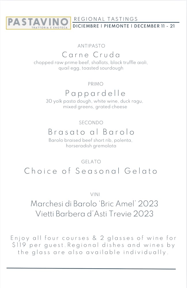 A tour that will showcase an antipasto, pasta, entree, and gelato flavor as well as two wines by the glass and several by the bottle from each region, available for 10 days a month at Pastavino!