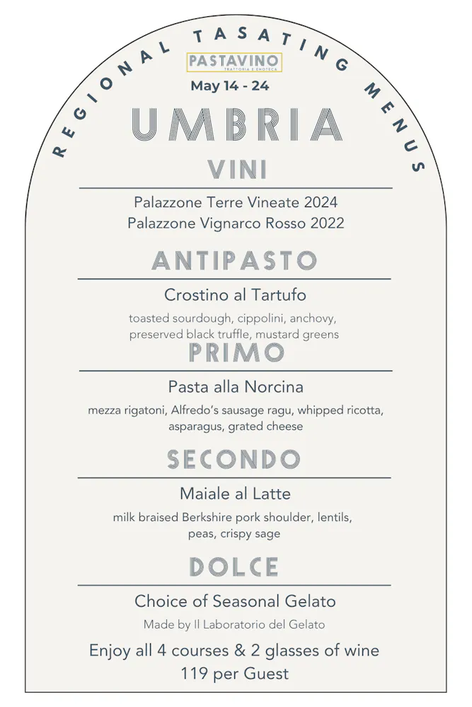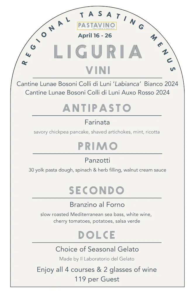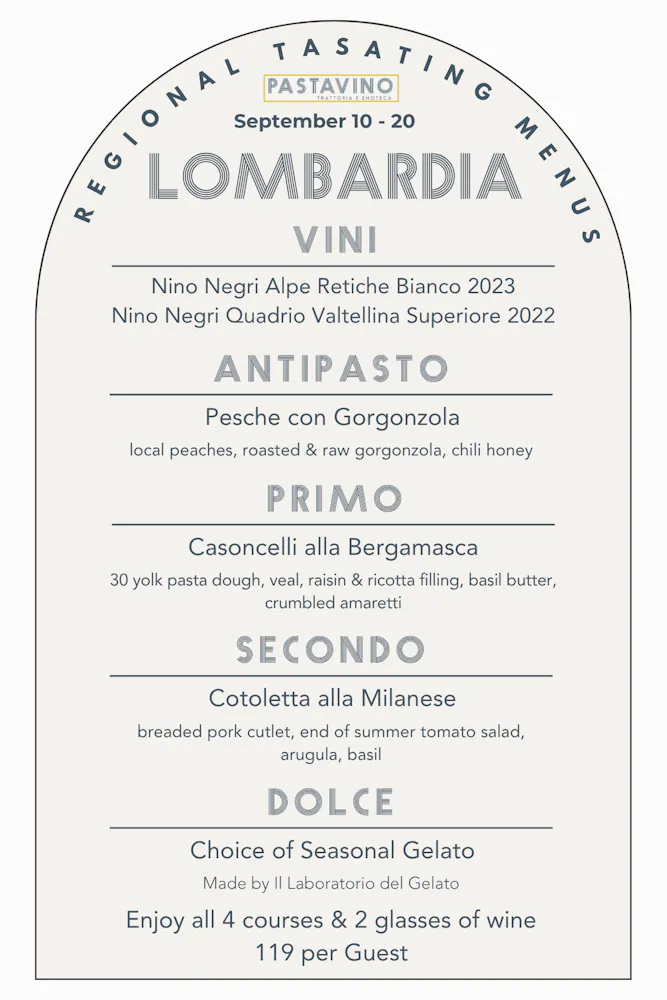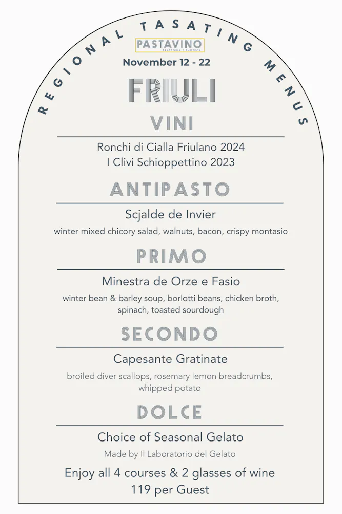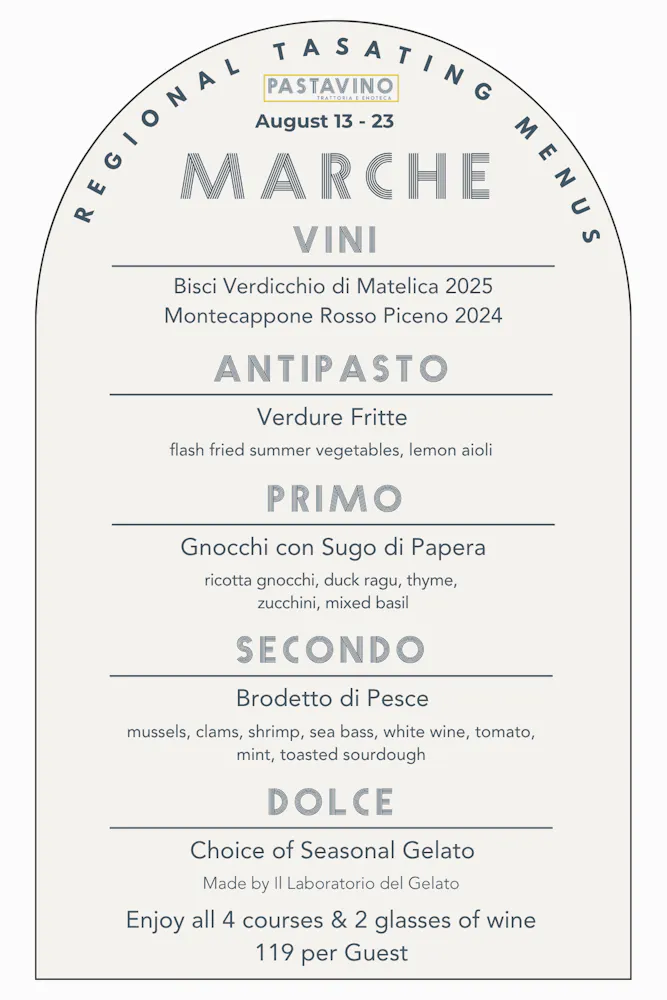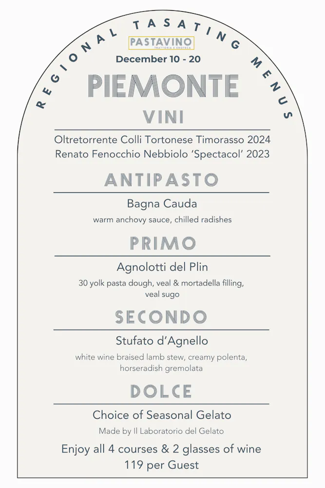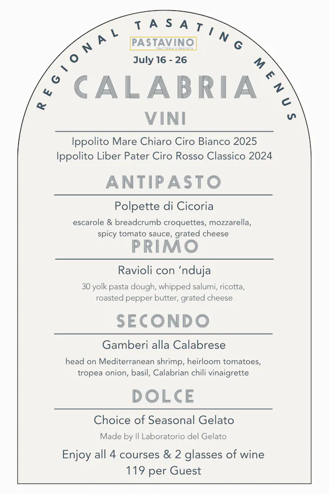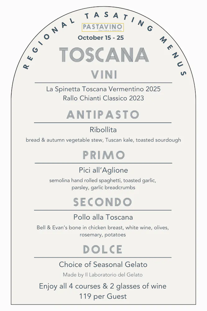 A tour that will showcase an antipasto, pasta, entree, and gelato as well as two wines by the glass and several by the bottle from each region, available for 10 days a month at Pastavino!