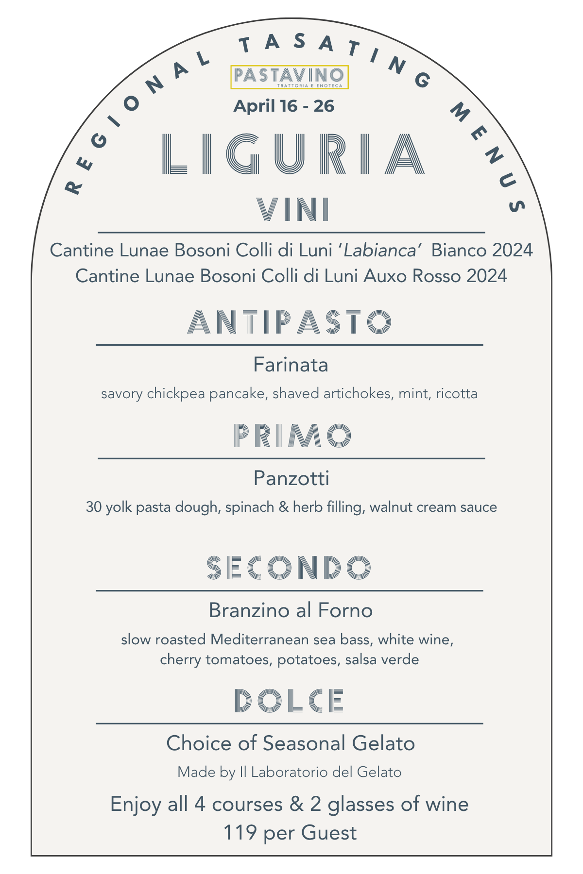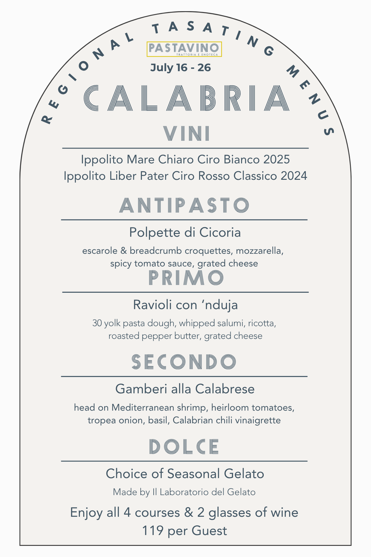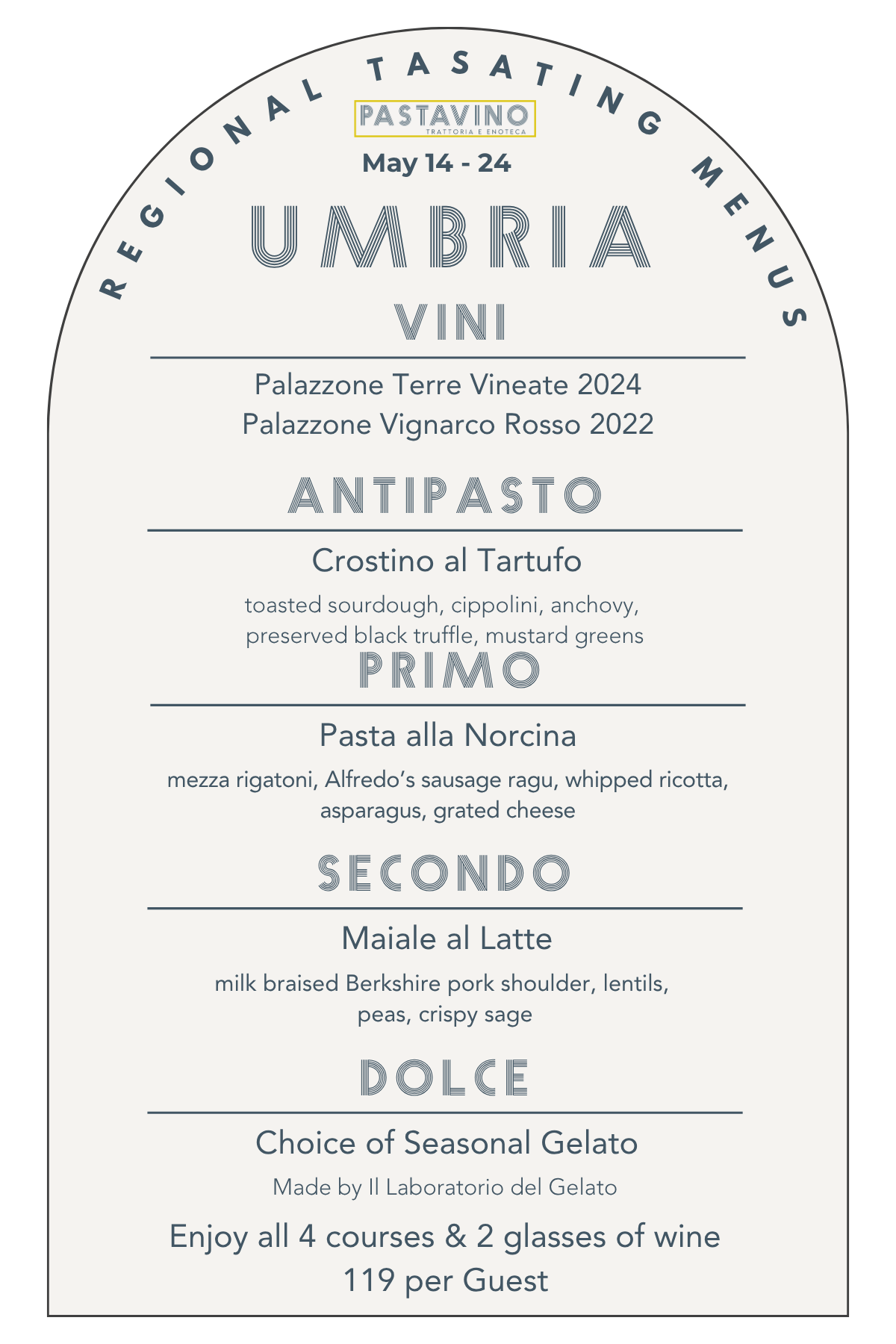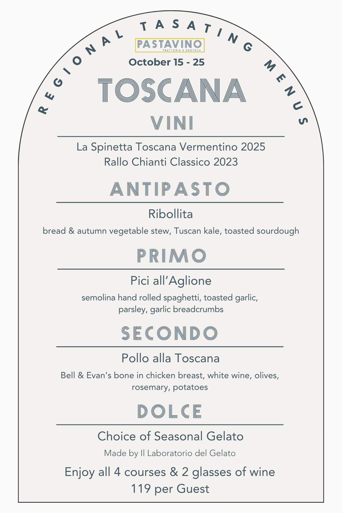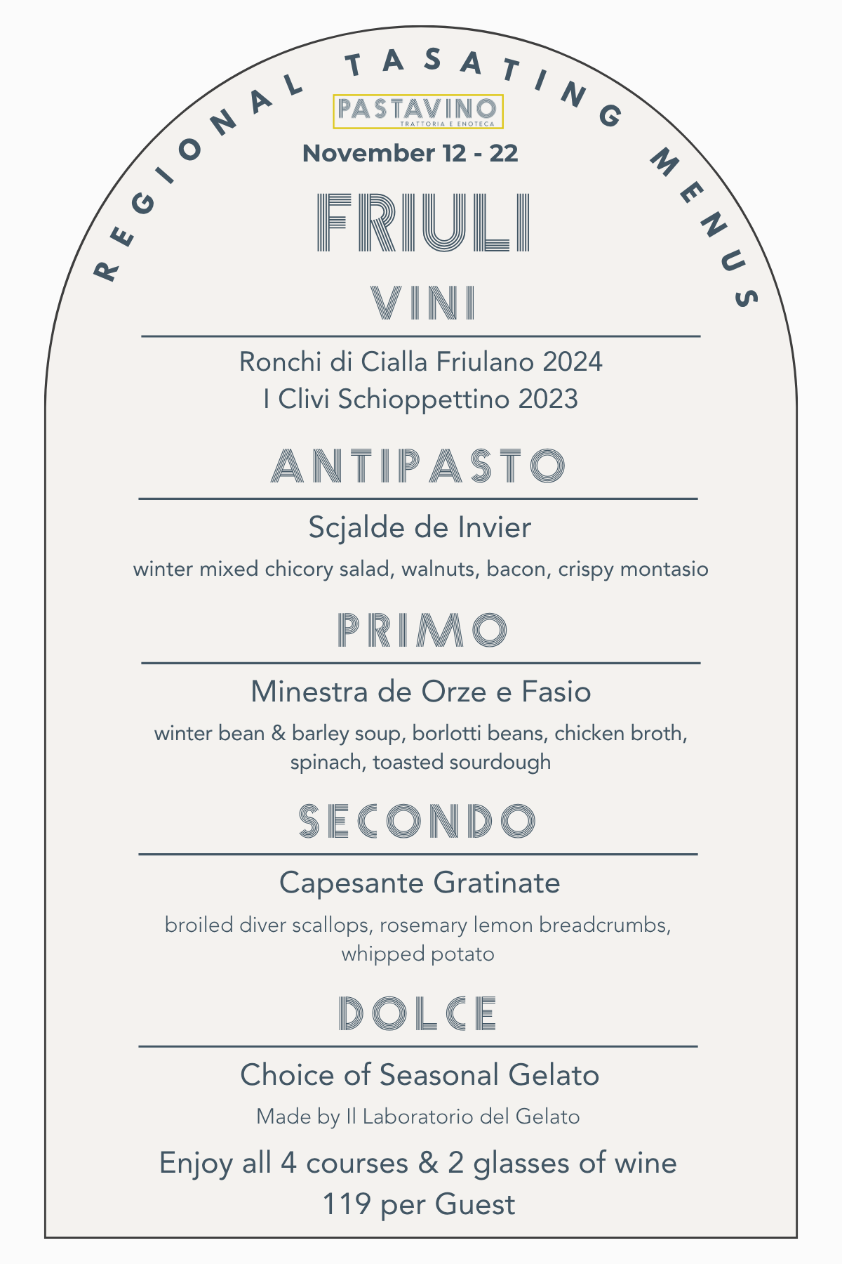 A tour that will showcase an antipasto, pasta, entree, and gelato as well as two wines by the glass and several by the bottle from each region, available for 10 days a month at Pastavino!