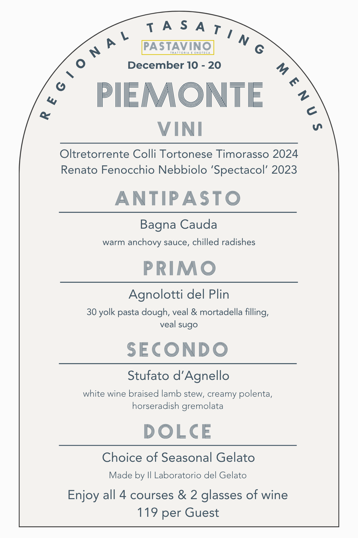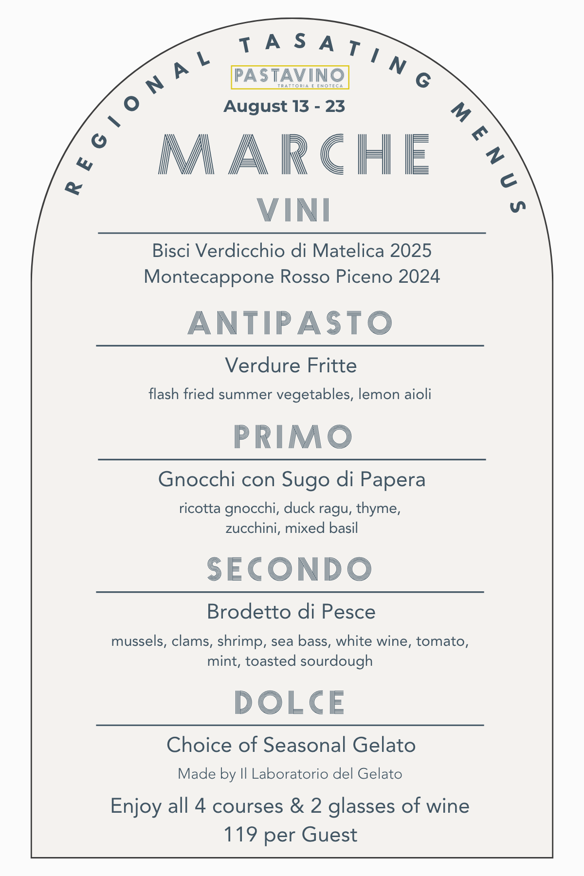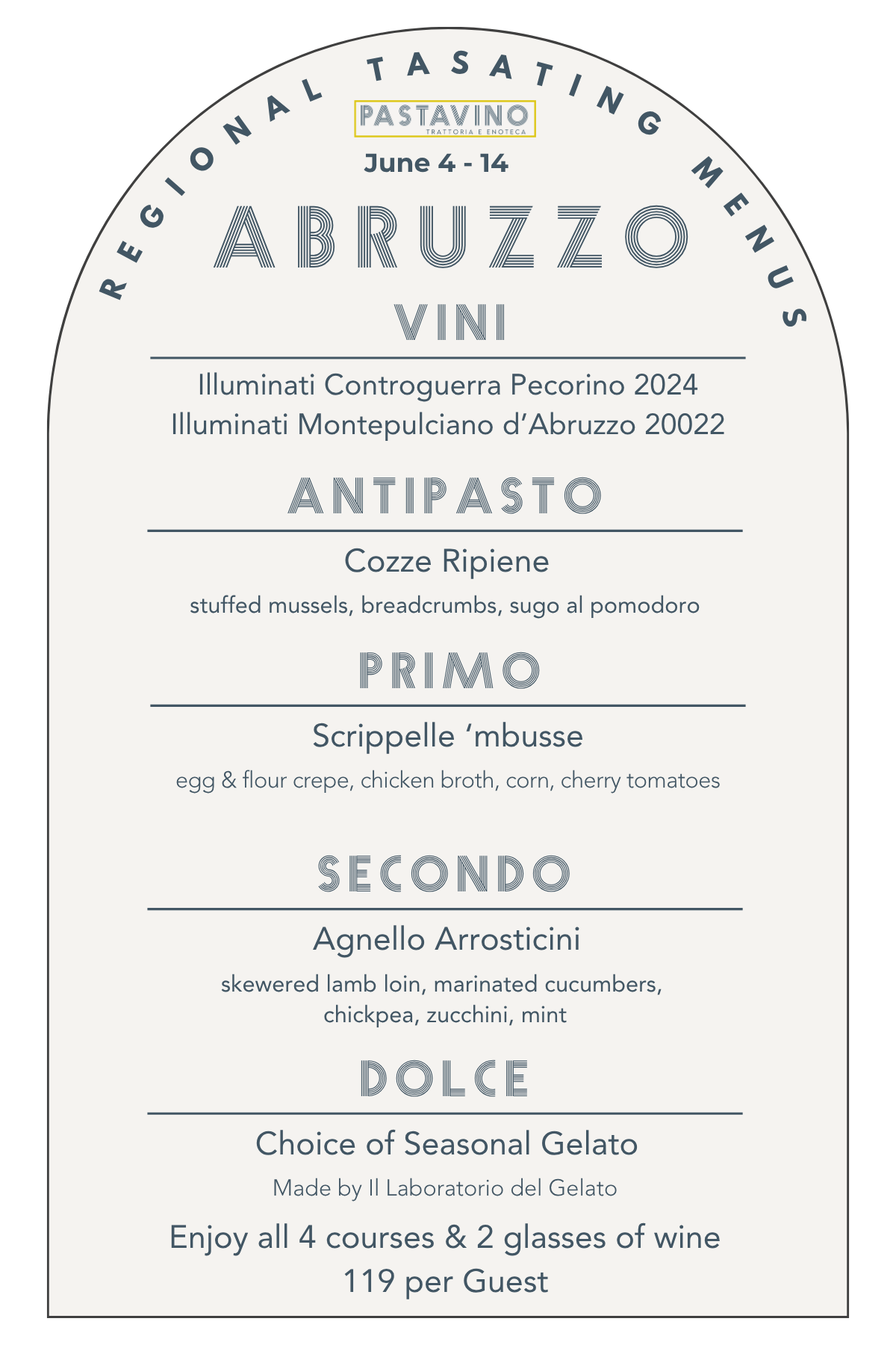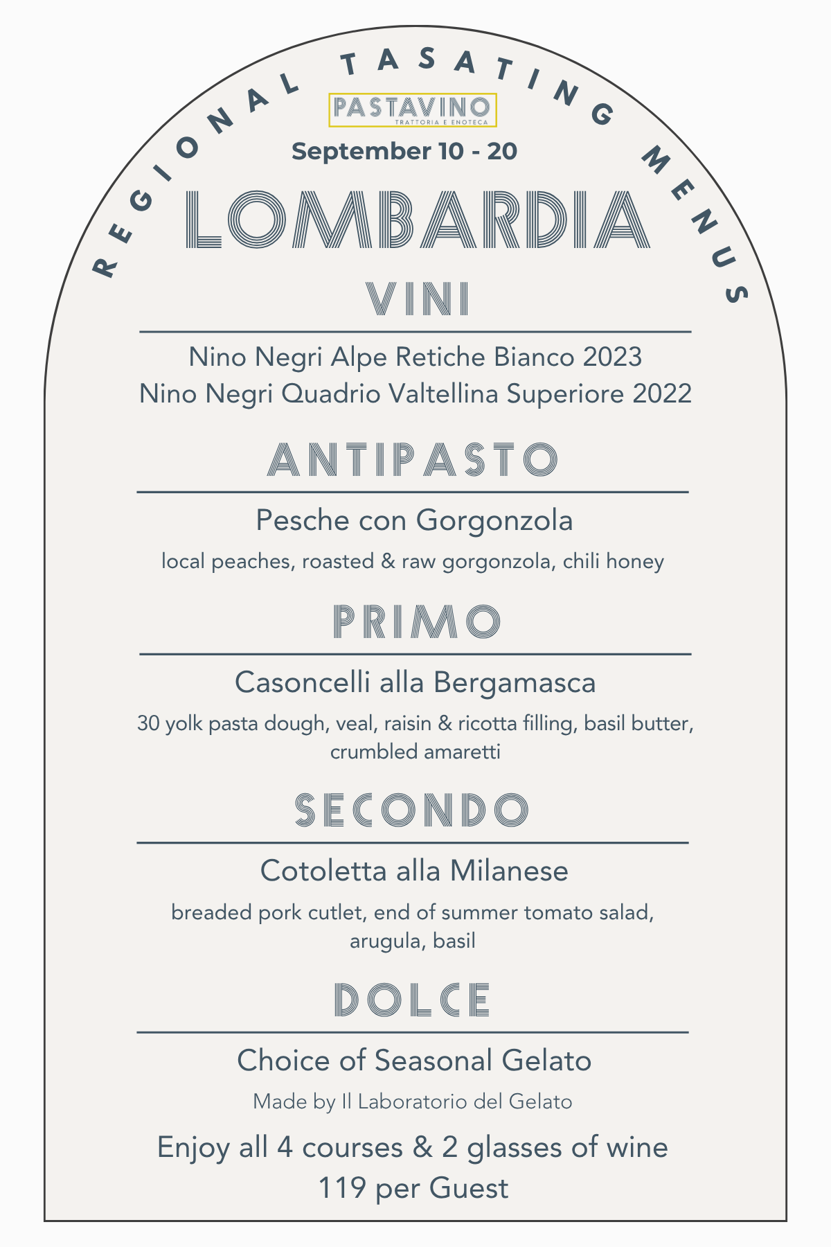 A tour that will showcase an antipasto, pasta, entree, and gelato as well as two wines by the glass and several by the bottle from each region, available for 10 days a month at Pastavino!